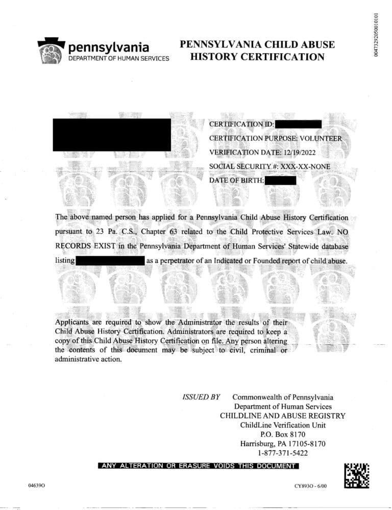 - Your Pennsylvania Child Abuse History Certification has been submitted. Your clearance will be sent to you via the delivery method you selected during this process.