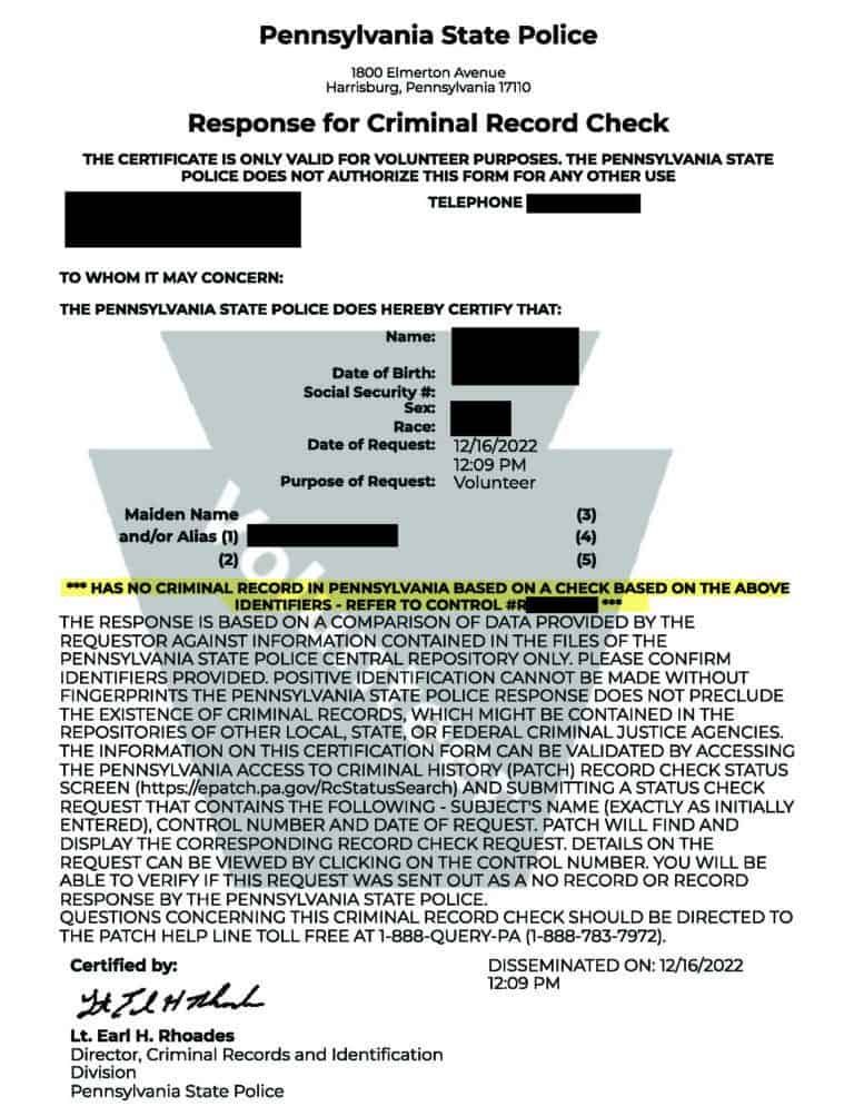 - A copy of your Pennsylvania State Police Response for Criminal Record Check appears on the screen. To print a copy or save as a PDF, click “Print.”